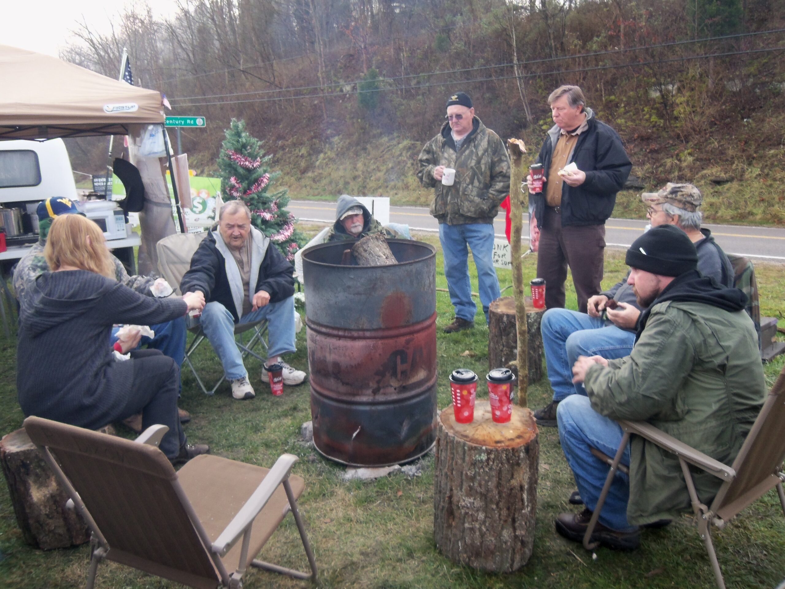 Luther Howard “Hoot” Gibson, standing in middle of Century Aluminum occupiers, with black cap and white coffee cup
