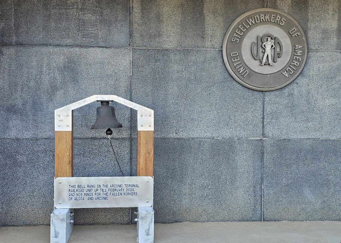 USW Local 309’s memorial bell was dedicated on Workers Memorial Day, April 29, 2024. Its aluminum was made in the Arconic Tennessee Operations facility. The wood used is to encapsulate the steel from the plant’s pot rooms to keep workers safe from grounding out. The marble was in an old building that was the office at the South Plant. The bell was taken off a locomotive in the bone-yard that was taken out of service.