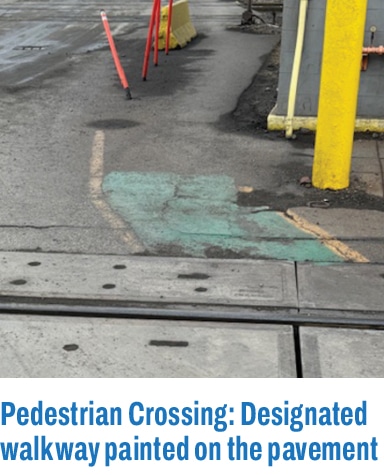 Pedestrian Crossings: Where pedestrians are permitted to cross the tracks at a highway-rail grade crossing, a designated pedestrian walkway shall be painted along the edge of the roadway in yellow or a high visibility color to identify the pedestrian walkway.