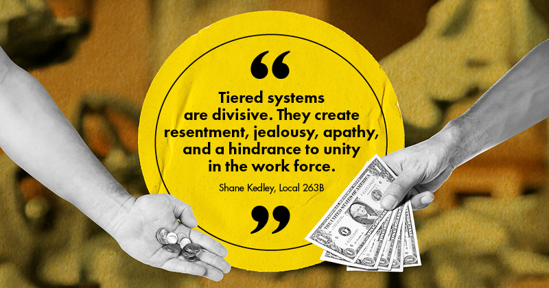 Unscrupulous employers often look for ways to divide union members, whether by age or job classification or other factors, and multi-tiered wage and benefit systems can play into bosses’ hands by helping them to serve that purpose.