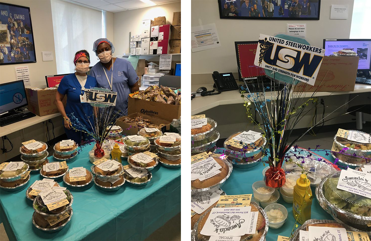 In Connecticut, USW Locals 12160, 12000, 134L and 859-4, with the help of several others, recently collected donations to provide lunch through Amanda’s Deli and Grill for the doctors and nurses at Yale New Haven Health, who work on the Covid-19 floor. The food even arrived with custom USW Thank You tags.