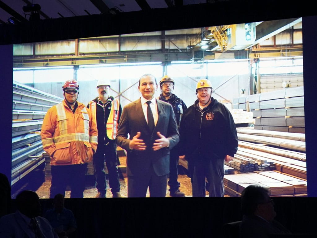 Wab Kinew, the premier of Manitoba, stood alongside four USW members at the Selkirk steel mill to deliver a video message praising convention delegates for “standing up for the rank and file.”