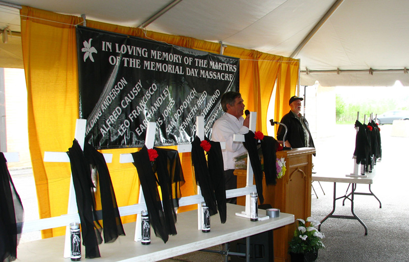 Next, the Women of Steel, the women’s caucus of United Steelworkers, AFL-CIO, gave a dramatic presentation that highlighted the Martyrs’ sacrifice. Each woman, dressed in black, called out the name of each Martyr. They told how each was killed, in most cases by a bullet in the back. In an impressive ceremony, Women of Steel draped each cross in black, ten in all.