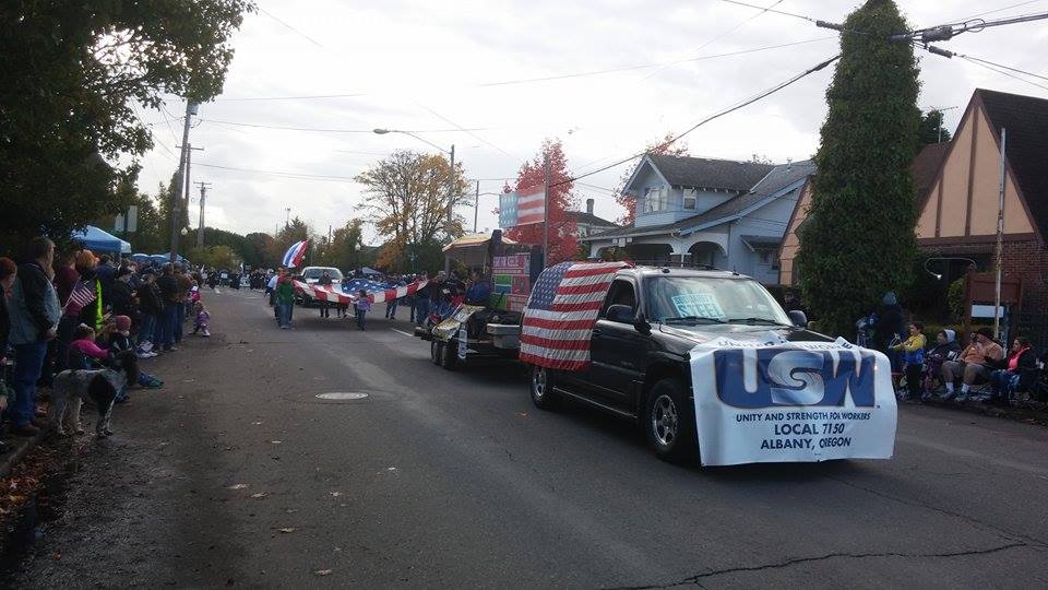 Locked out Steelworkers and families at ATI locations around the country took the time to honor our nation’s Veterans on Veterans Day.  From thank you support signs on the picket lines, to Local 7150’s float in the Albany, Oregon Veterans Day Parade, Steelworkers recognized the veterans who have sacrificed so much for our country.