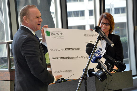 Pennsylvania State Treasurer Rob McCord delivered more than $17,700 to the United Steelworkers on Monday (Feb. 25, 2013) as part of a campaign to return $1.9 billion in unclaimed property held by the state.