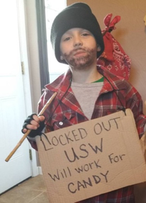 While most kids wanted to dress up as monsters or their favorite super heroes for Halloween, Caleb saw the holiday as an opportunity to spread the word about the lockout and build community support. This Steelworker kid put on a sign saying ‘Locked Out USW Member. Will Work for Candy,’ and dressed as a locked out union member for Halloween. Caleb’s dad Don Coy is a locked out member of USW Local 1138 from Bagdad, PA.