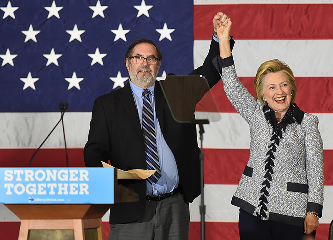 Gerard and Secretary Clinton clasped hands aloft as the overflowing crowd that included many USW members cheered. She called Gerard a champion of working people for as long as she has known him.