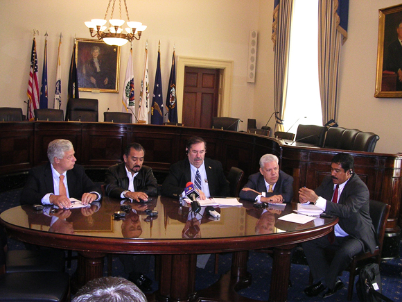 The USW and AFL-CIO panel on Mexican independent union worker rights that testified before a congressional briefing are (left to right): U.S. Rep. Michael Michaud (D-ME); Francisco Hernández Juárez, general secretary of the Mexican Union of Telephone Workers (STRM); Leo W. Gerard, USW international president; Marco del Toro, legal counsel to Los Mineros; and Sergio Beltrán Reyes, internal and external affairs and recording secretary for Los Mineros.