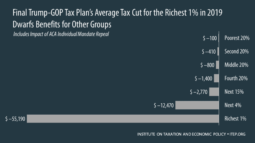 Workers will need some cheer when the bills come due even as they watch the wealthy use their tax handouts to buy extra Mercedes for Christmas. Every year. The average tax break for the 1 percent will be $55,000. That’s a couple thousand dollars more than the median income in the United States, in other words, what all of the workers in a typical American household make together for an entire year.