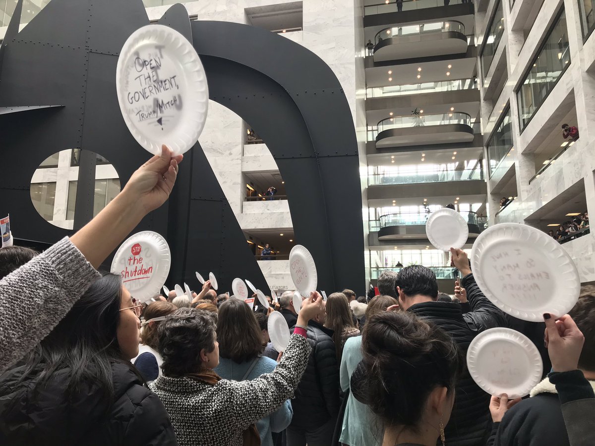 Thousands of federal employees protested at the Hart Senate Office Building in Washington, D.C., this week, holding aloft empty plates during 33 minutes of silence – one minute for each day of the government shutdown. Some plates carried the message, “Will work for pay.”